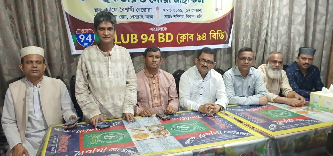 CLUB 94 BD এর উদ্যোগে উদ্যোগে ৭ম প্রতিষ্ঠা বার্ষিকী, দোয়া ও ইফতার মাহাফিল প্রতিষ্ঠাতা সদস্য তসলিম উদ্দীন রানার সভাপতিত্বে ঢাকা তোপখানা রোড বৈশাখী রেস্তোরাঁয় অনুষ্ঠিত হয়।স্বাগত বক্তব্য রাখেন উদযাপন কমিটির আহবায়ক আব্দুস সালাম পলাশ।শুভেচ্ছা বক্তব্য রাখেন সুপ্রিম কোর্টের আইনজীবী এডভোকেট শহীদুল ইসলাম। অনুষ্ঠান সঞ্চালন করেন জগন্নাথ বিশ্ববিদ্যালয়ের ডেপুটি রেজিস্ট্রার ও সদস্য সচিব হেদায়েত উল্লাহ তুর্কী।মরহুম বন্ধুদের আত্মার মাগফেরাত কামনা,প্রত্যেকের মরহুম মা-বাবা,অসুস্থ বন্ধুদের জন্য দোয়া ও মোনাজাত পরিচালনা করেন এমদাদুল হক মিলন।