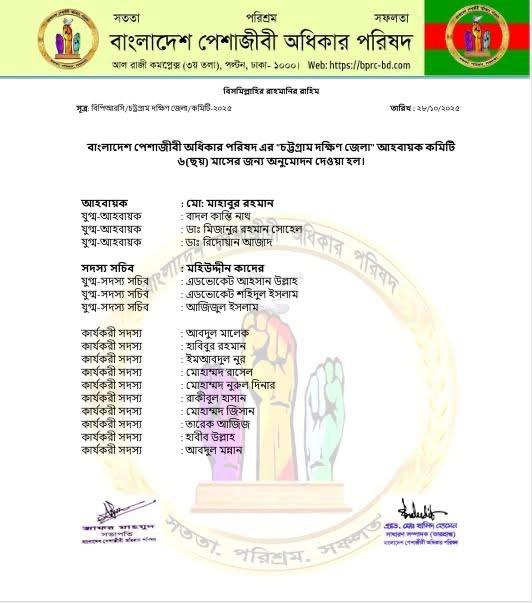 বাংলাদেশ পেশাজীবী অধিকার পরিষদ- চট্টগ্রাম দক্ষিণ জেলার সাংগঠনিক কার্যক্রম গতিশীল করার লক্ষ্যে ২৮ নভেম্বর দিবাগত রাতে বাংলাদেশ পেশাজীবী অধিকার পরিষদ কেন্দ্রীয় কমিটির সভাপতি ডাঃ জাফর মাহমুদ ও সাধারণ সম্পাদক এডভোকেট মোঃ খালিদ হোসেন স্বাক্ষরিত বিজ্ঞপ্তিতে জানানো হয়।