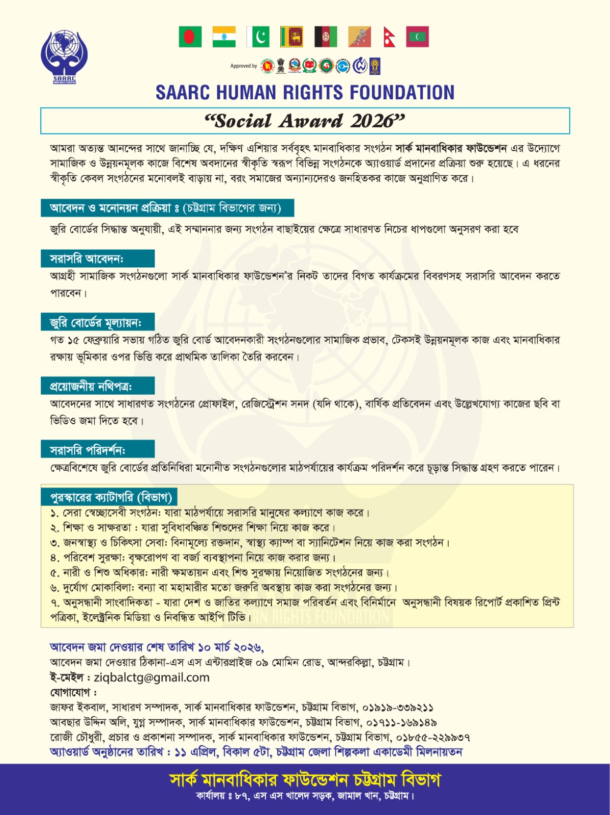 আগামী ১১ এপ্রিল ২০২৬ শনিবার বিকেল ৫ টায় জমকালো আয়োজনে চট্টগ্রাম জেলা শিল্পকলা একাডেমী মিলনায়তনে অনুষ্ঠিত হবে। অনুষ্ঠানে সার্কভুক্ত দেশসমূহের প্রতিনিধিগণ উপস্থিত থাকবেন।