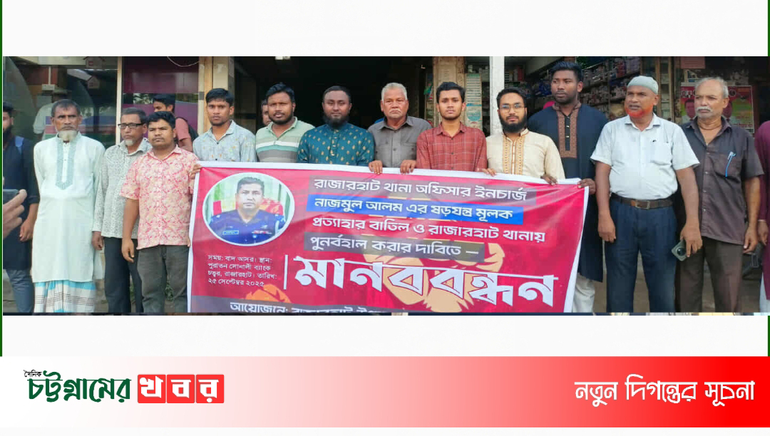 মোঃ শফিকুল ইসলাম নিজস্ব প্রতিবেদকঃ কুড়িগ্রামের রাজারহাটে থানার অফিসার ইনচার্জ (ওসি) নাজমুল আলম লিংকনের ষড়যন্ত্রমূলক প্রত্যাহারের প্রতিবাদে মানববন্ধন কর্মসূচি পালন করেছে এলাকাবাসী। বৃহস্পতিবার ২৫ সেপ্টেম্বর বিকাল ৪.০০টা দিকে পুরাতন সোনালী